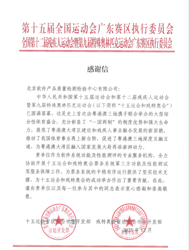 近日,软测中心公司圆满完成了第十五届全运会及第十二届残运会票务系统保障任务,获得赛区执委会感谢信。项目团队以高度的政治责任感和专业精神,全力护航赛事平稳运行,彰显了软测中心公司在重大活动保障中的技术实力与担当。