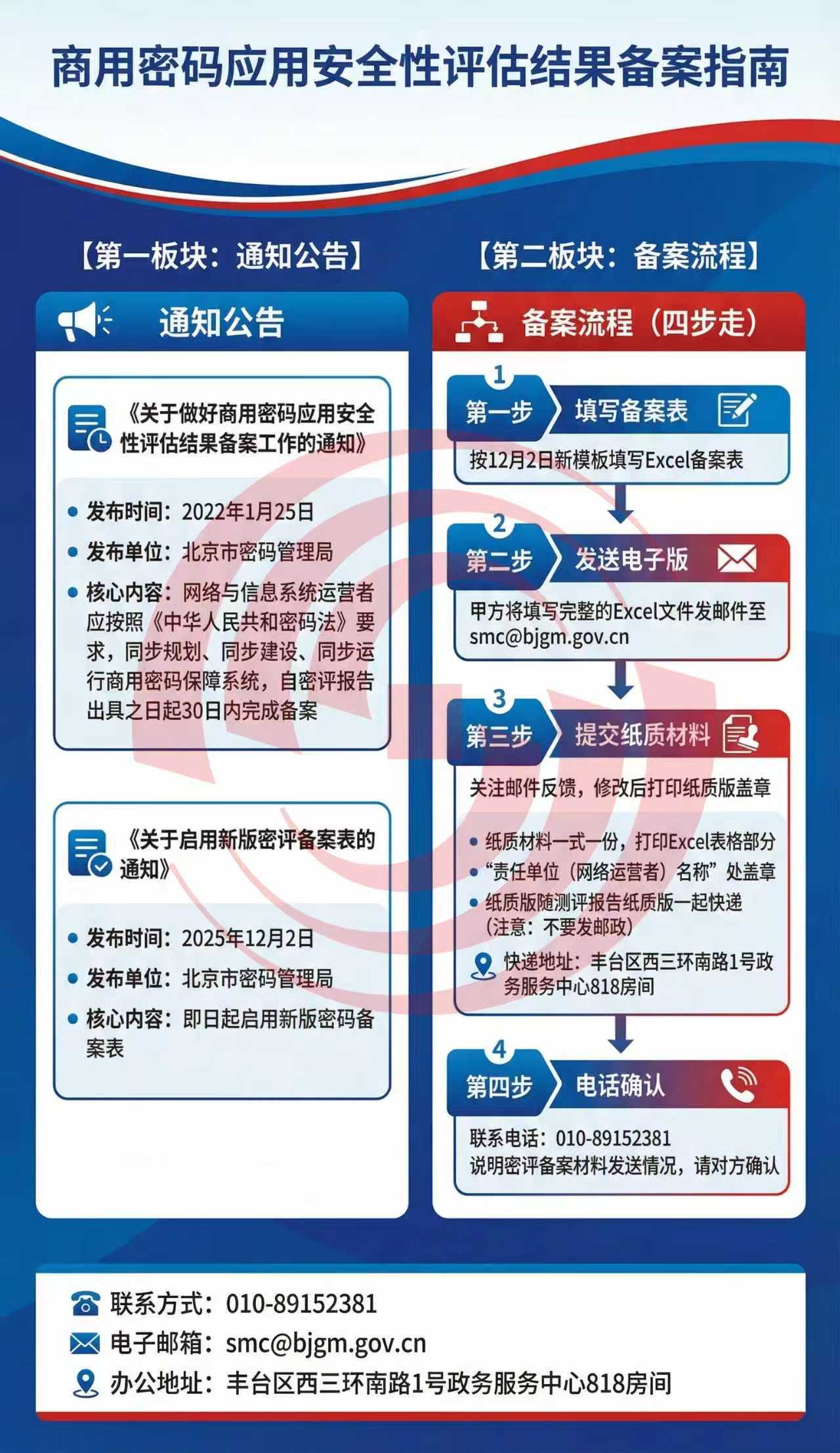 2025年12月2日,北京市密码管理局官网发布《关于启用新版密评备案表的通知》,提出接国家密码管理局通知,即日起启用新版密码备案表,样表及填写说明详见附件。我公司总结了结果备案指南,供参考。
