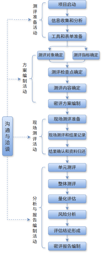 依据国家法律法规和标准规范,对网络与信息系统中商用密码技术、产品和服务的合规性、正确性、有效性进行全面评估的活动。测评内容包括技术评估和管理评估。技术评估通过工具测试、访谈、文档审查等方式,对被测对象从物理环境、网络通信、设备计算、应用数据等方面验证合规性。管理评估通过访谈、文档审查等方式,对被测对象从管理制度、人员管理、建设运行、应急处理等方面验证合规性。