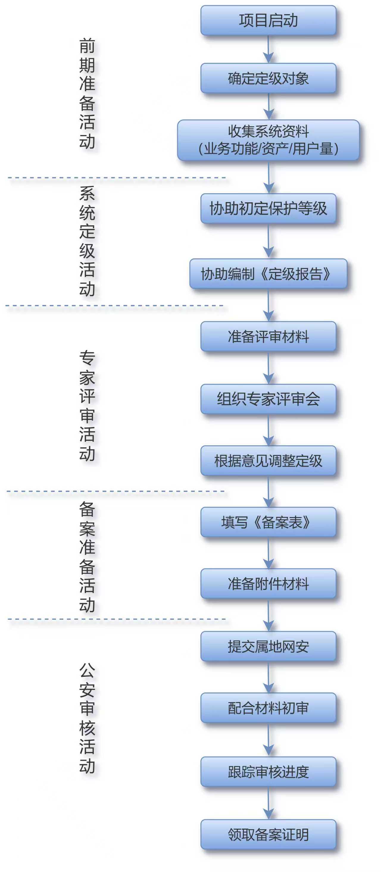 提供从定级前的需求调研,到备案材料编制、提交及后续沟通协调的全过程服务。协助客户明确定级对象,基于业务信息安全和系统服务安全两个维度识别受侵害客体,评估侵害程度,综合确定业务信息安全等级与系统服务安全等级,进而精准判定系统安全保护等级;协助制定符合国家标准的定级报告,确保定级结论合规准确;协助准备备案材料,全程跟进备案进度,及时响应并解决备案过程中的问题。