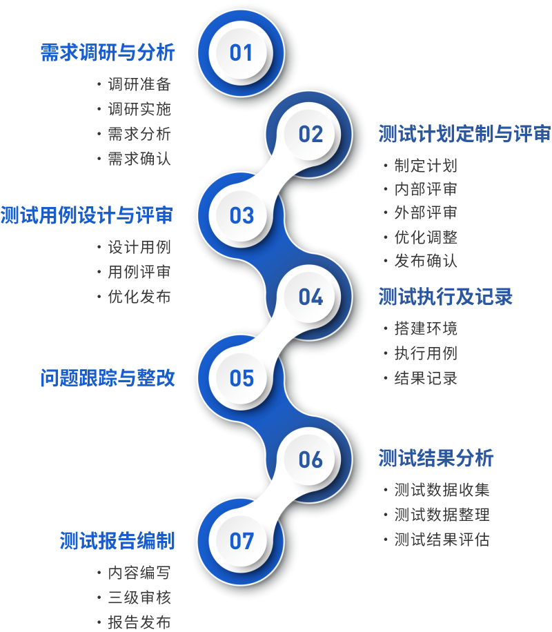 源代码样品接收——测试计划制定与评审——测试用例设计与评审——源代码测试准备——源代码测试执行——源代码测试结果分析——漏洞问题跟踪与整改——测试结果分析——测试报告编制
